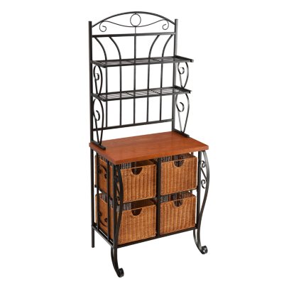 Simple and stylish, this baker's rack solves the storage issues of the kitchen. Take advantage of the spacious four wicker drawers measuring 14"D x 11"W x 8.5"Hl to store your dishtowels, pots, pans, cookbooks and more. The shelves are perfect for showing off fancy plates and cups. The 30" tall cherry counter is 17" deep and laminated to give a butcher-block style appearance. Above the countertop, the two deep wire shelves measure 8.5" deep with approximately 8.5" between them. Attractive and beautiful, this traditional baker's rack will make a wonderful addition to your … Read more